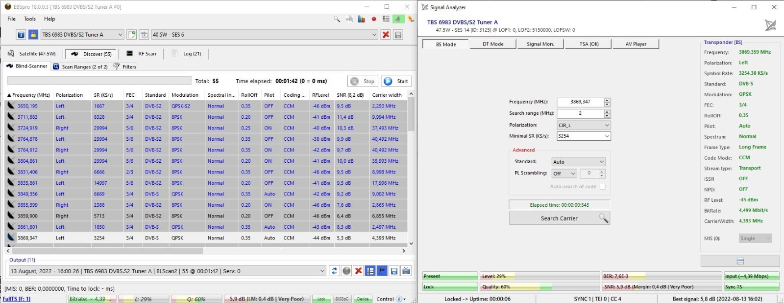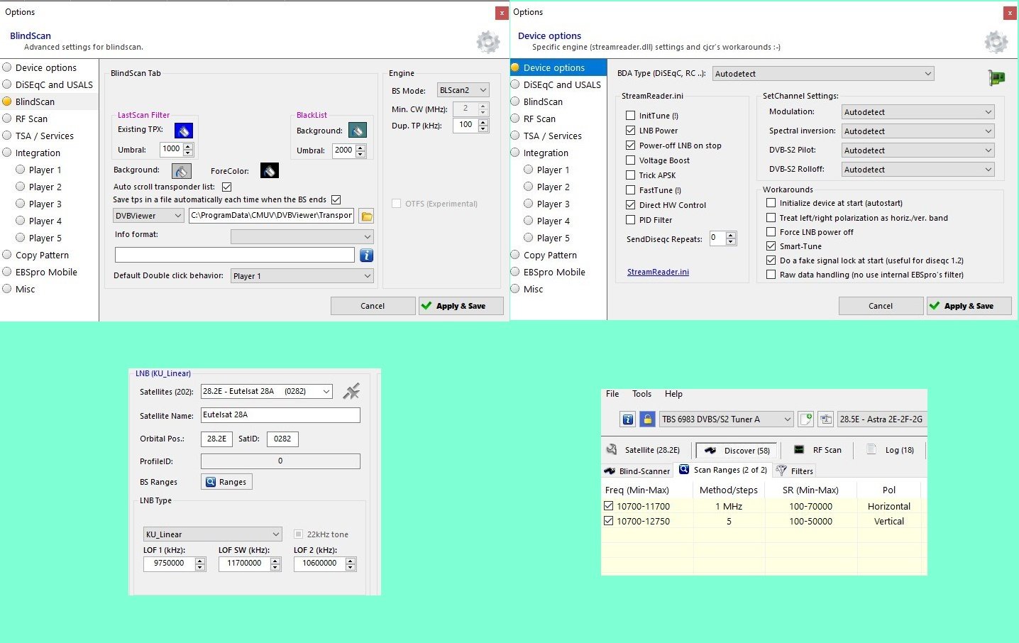 Après un très long moment de break ( mon dieu que le temps passe vite ) j'ai eu l'occasion de récupérer un antenne d'1m10, j'ai donc démonté la mienne et remonté celle là à bout de bras... j'avais oublié que c'était complexe sur un escabeau, bref après quelques heures, j'ai réussi à avoir un bon arc et de bonnes surprises, le faisceau Est de TurkSat avec près de 9db..... j'avais réglé cela avec EBS Pro via le téléphone ( très bonne application en passant ..) maintenant que tout est fait, je pense que mon logiciel ne doit pas être bien configuré car j'ai des fréquences farfelues ( colonne de droite sur la capture d'écran) , je 0 db sur le rf scan mais 18.2db sur la barre de bas.... si quelqu'un ( si quelqu'un est encore actif ici ) peut mon trouver le hic....Sinon AntAdjust n'existe plus ? je ne trouve plus du tout sur le net ....