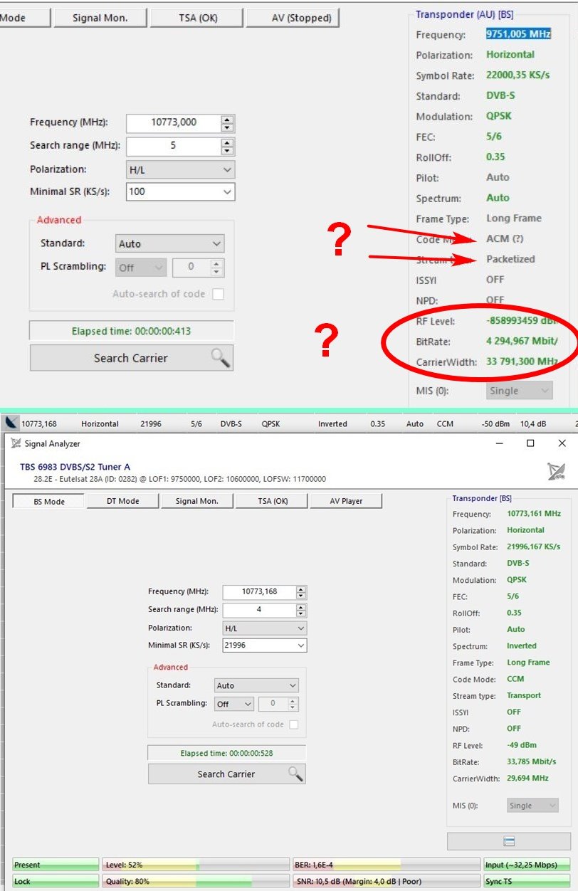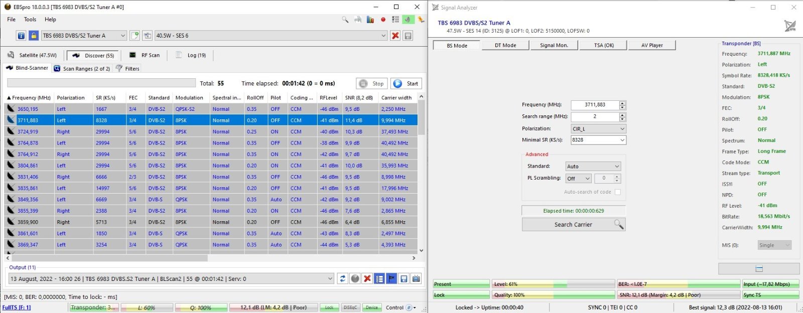 Après un très long moment de break ( mon dieu que le temps passe vite ) j'ai eu l'occasion de récupérer un antenne d'1m10, j'ai donc démonté la mienne et remonté celle là à bout de bras... j'avais oublié que c'était complexe sur un escabeau, bref après quelques heures, j'ai réussi à avoir un bon arc et de bonnes surprises, le faisceau Est de TurkSat avec près de 9db..... j'avais réglé cela avec EBS Pro via le téléphone ( très bonne application en passant ..) maintenant que tout est fait, je pense que mon logiciel ne doit pas être bien configuré car j'ai des fréquences farfelues ( colonne de droite sur la capture d'écran) , je 0 db sur le rf scan mais 18.2db sur la barre de bas.... si quelqu'un ( si quelqu'un est encore actif ici ) peut mon trouver le hic....Sinon AntAdjust n'existe plus ? je ne trouve plus du tout sur le net ....