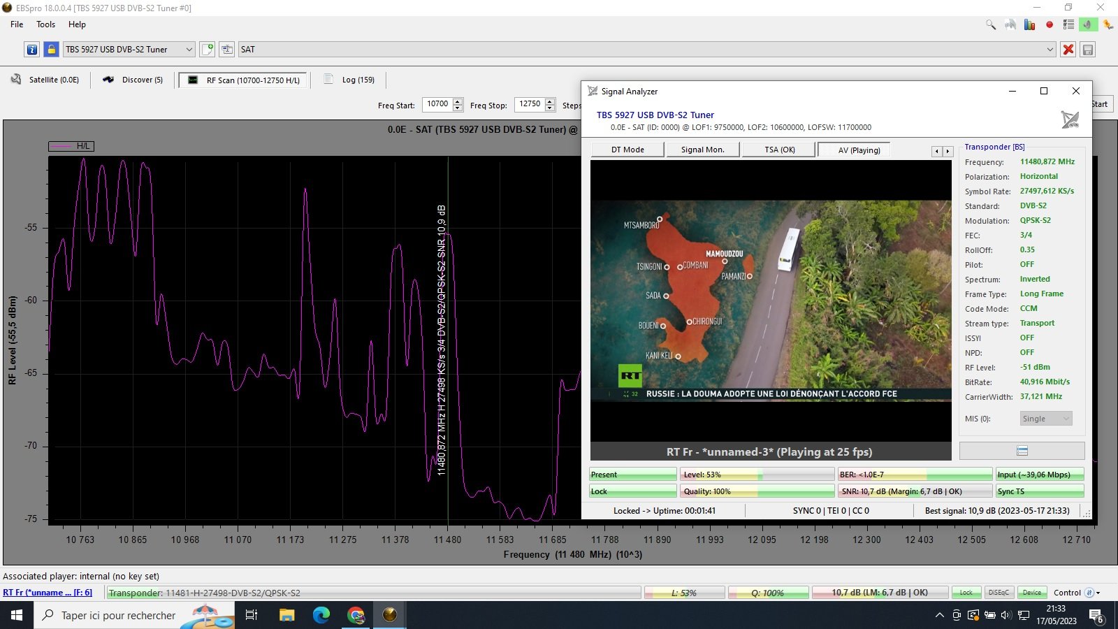 - Matériel de réception : Channel Master 1.00 ( 70.5°E - 63°W ) + Echostar AP-700 + TBS 5927 sur PC Lenovo ThinkCentre M920S.