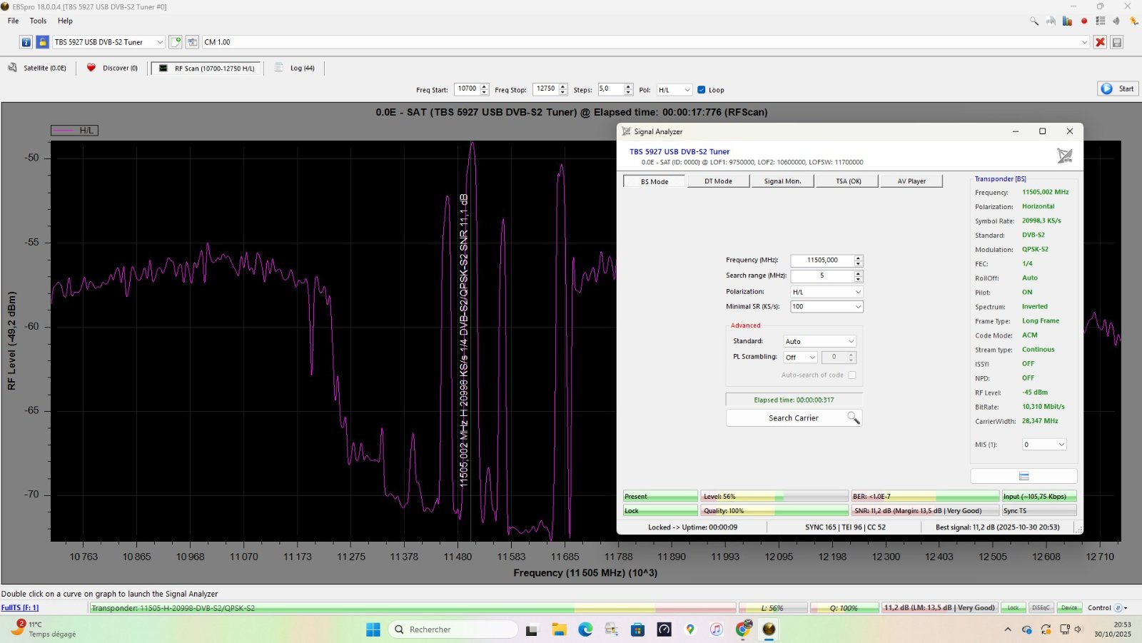 Matériel de réception : Channel Master 1.00 ( 70.5°E - 63°W ) + Echostar AP-700 + TBS 5927 sur PC Lenovo ThinkCentre M920S.