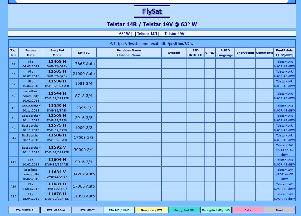 ...Le site de Flysat à changé depuis la dernière fois que je l'ai consulté, et effectivement la liste ne dépasse pas le 58W. Mais je te confirme que c'est bien lui car j'ai conservé une capture d'écran "d'époque" et c'est bien la bonne fréquence, même polar, même SR.